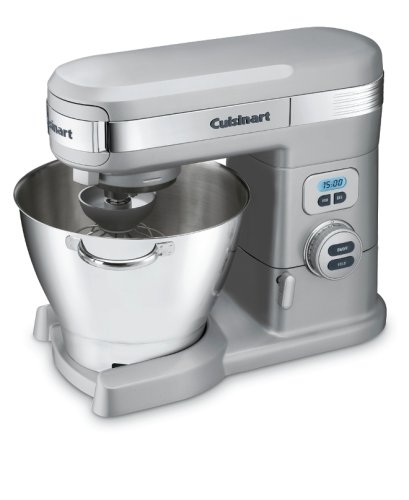 | The mixer's tilt-back head securely locks the stand mixer into a raised position, which allows easy access to the 5-quart mixing bowl and makes it easy to attach accessories. The stainless-steel bowl includes handles, which makes the bowl easy to hold, scrape, and remove, and it's oversized to let you mix larger quantities. The mixer has a handy 15-minute countdown timer, plus a slow-start function that eliminates splatter for the most delicate ingredients. The fold function allows you to mix in ingredients at the lowest speed with two options--continuous, to blend ingredients, and pulse, to combine ingredients. Each pulse generates 1-1/2 to 2-1/2 revolutions of the flat mixing paddle, chef's whisk, or dough hook. The flat mixing paddle, dough hook, or chef's whisk spins independently while rotating around the mixing bowl for the quickest, most thorough results. No need to rotate the mixing bowl--Cuisinart’s stand mixer does all the work for you. |